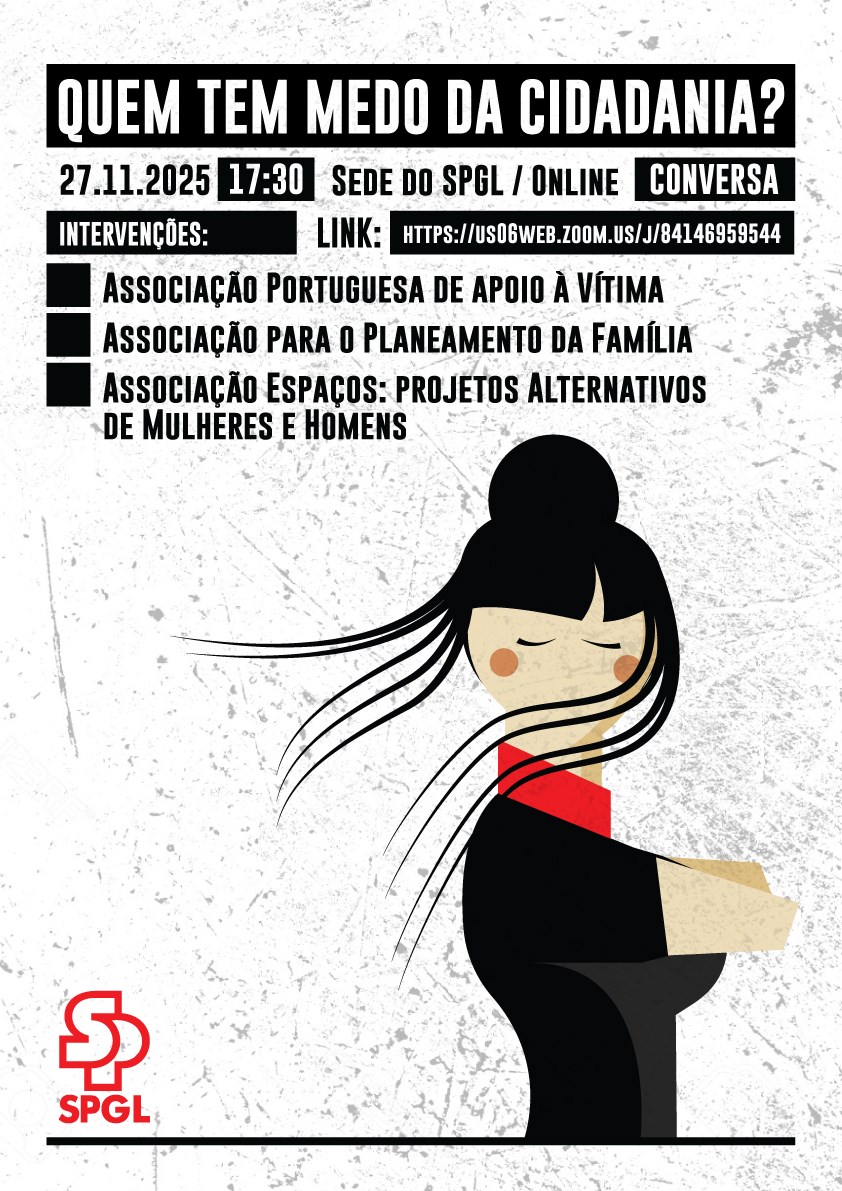 No âmbito do Dia Internacional para a Eliminação da Violência Contra as Mulheres, assinalado a 25 de Novembro, o SPGL promoverá uma Conversa à volta do tema “Quem tem medo da Cidadania? no dia 27 de novembro de 2025 (5ª feira), às 17h30, no Auditório da Sede do Sindicato e online. As intervenções ficarão a cargo das seguintes Instituições: Associação Portuguesa de Apoio à Vítima, Associação para o Planeamento da Família e Associação Espaços – Projetos Alternativos de Mulheres e Homens.