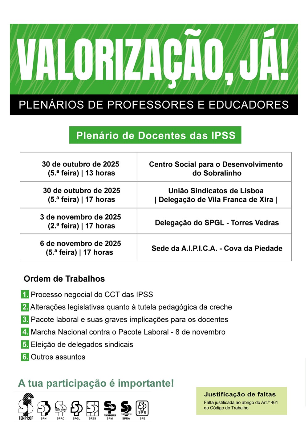 É indispensável a participação de professores, educadores e investigadores na Marcha Nacional Contra o Pacote Laboral agendada para o próximo dia 8 de novembro, às 14 horas e 30 minutos, em Lisboa. O governo pretende fazer uma alteração agressiva da legislação do trabalho ("Pacote Laboral"), negativa para o país e para os trabalhadores. São mais de 100 alterações contrárias aos direitos gerais dos trabalhadores, incluindo docentes e investigadores.