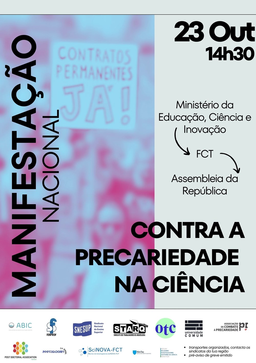 Juntamo-nos, às 14:30 horas, em frente ao Ministério da Educação, Ciência e Inovação (Avenida Infante Santo 2, 1350-178 Lisboa). A manifestação passará pela Fundação para a Ciência e a Tecnologia e terminará em frente à Assembleia da República.