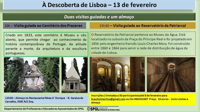 No próximo dia 13 de Fevereiro, quarta-feira, vamos fazer duas visitas guiadas muito interessantes: de manhã ao Cemitério dos Prazeres, em Campo de Ourique, e à tarde ao Reservatório da Patriarcal, na Praça do Príncipe Real.