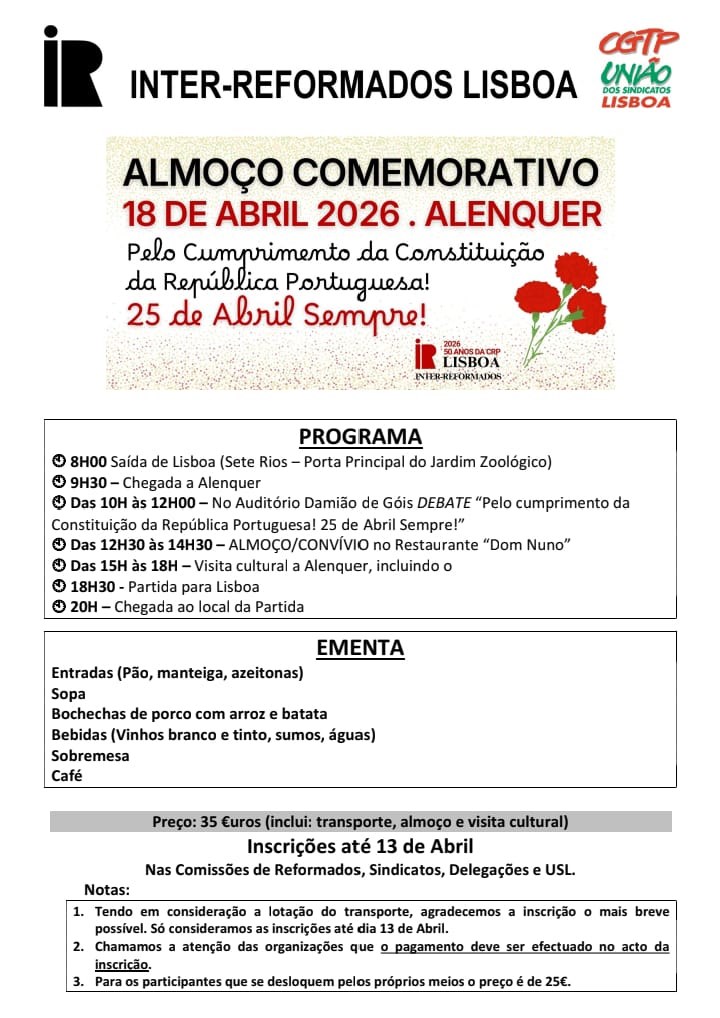 Este almoço comemorativo dos 52 anos da revolução de Abril e dos 50 anos da Constituição da República é já dia 18 de Abril