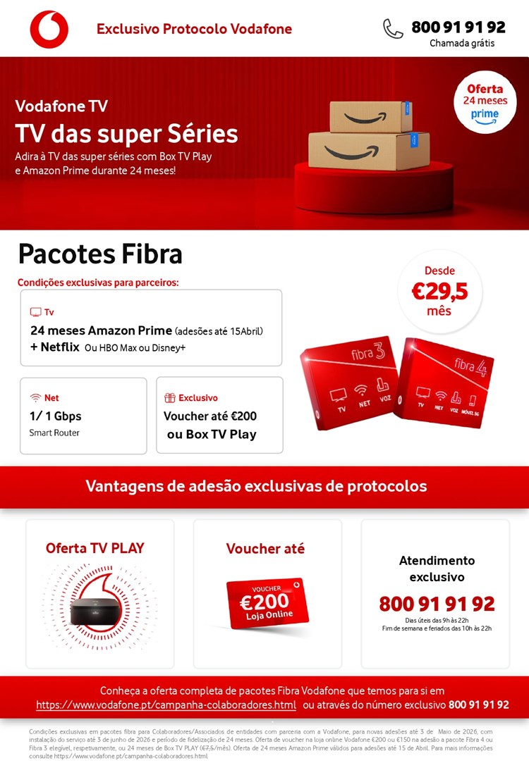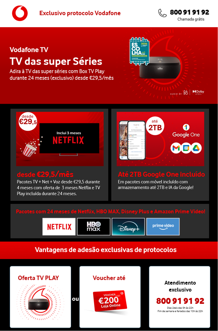 Benefícios associados à campanha da Vodafone Exclusiva para Parceiros em vigor à data da adesão ao serviço, que podem ser consultados aqui.
