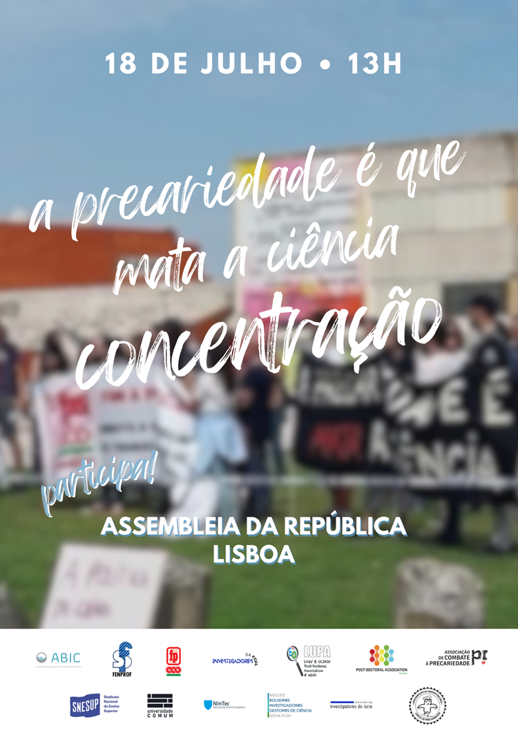 Apelamos a todos os trabalhadores científicos, doutorados e não doutorados, a que participem na concentração contra a precariedade na ciência, no dia 18 de julho, com início às 13h00, em frente à Assembleia da República.