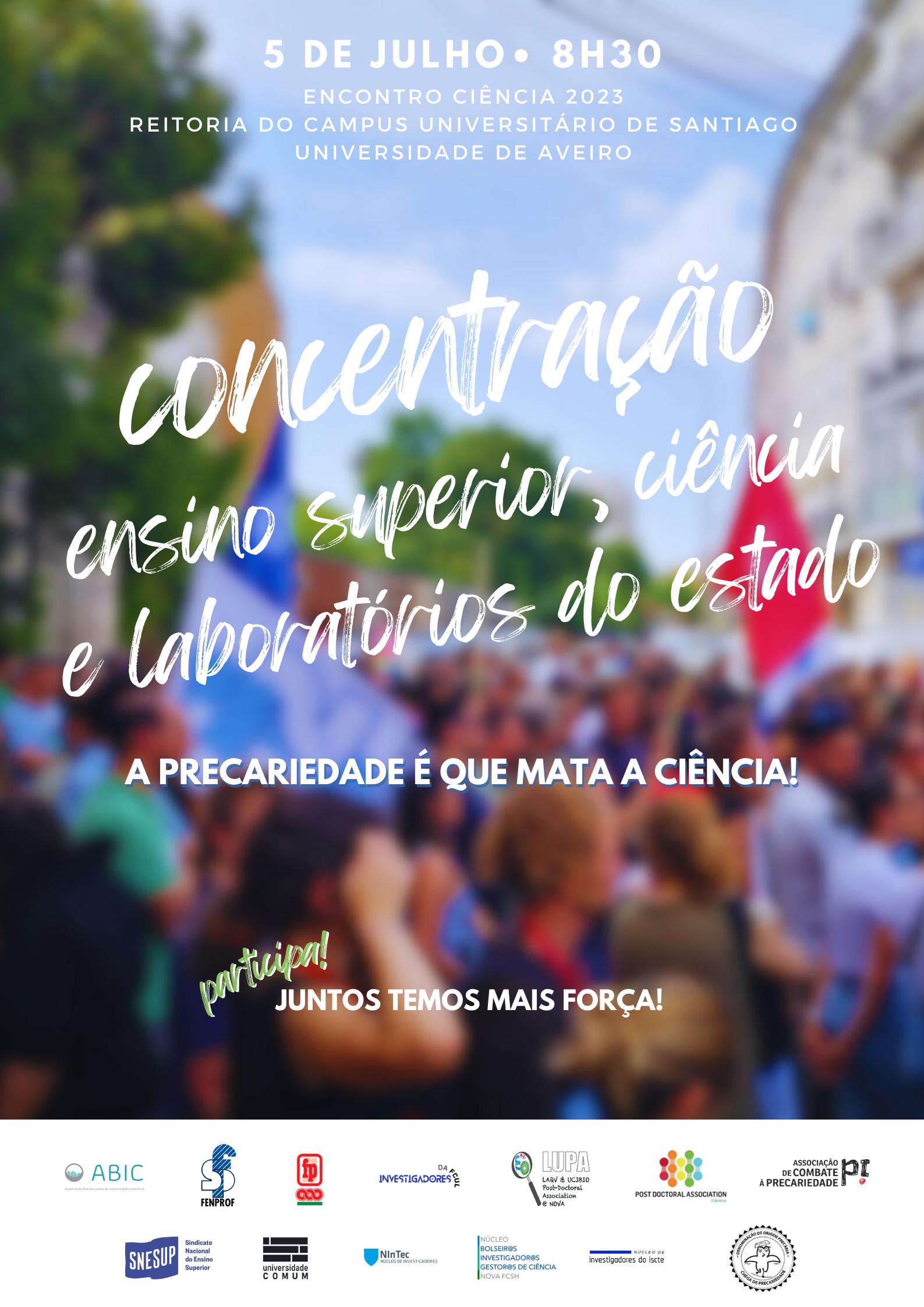 Neste contexto, apelamos a que no próximo dia 5 de Julho os trabalhadores científicos doutorados e não doutorados, que desenvolvem atividades de investigação, de docência ou que têm funções técnicas, adiram a uma concentração contra a precariedade na ciência, com início às 8h30, em Aveiro. A participação na primeira sessão do Encontro Ciência necessita de uma inscrição em https://www.encontrociencia.pt/2023/registo/