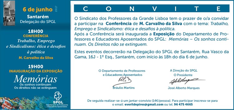 Carvalho da Silva veio a Santarém na passada terça-feira. O pretexto foi a inauguração de uma exposição da iniciativa dos professores e educadores aposentados do SPGL. O conjunto dos trabalhos expostos com a designação: “ Memórias- os sonhos continuam, os direitos não se extinguem” vão estar patentes na Delegação do Sindicato dos Professores da Grande Lisboa até dia 21 deste mês de junho, e podem ser vistos durante o horário de funcionamento da Delegação.
