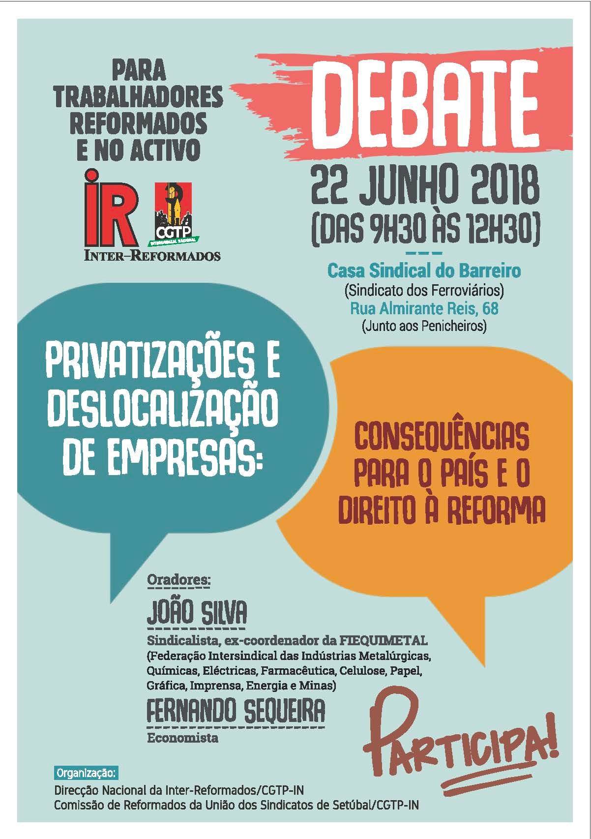 No passado dia 22 de junho de 2018, organizado pela Direção Nacional da Inter-Reformados/CGTP- In e a Comissão de Reformados da União de Sindicatos de Setúbal/CGTP–In, realizou –se um debate na Casa Sindical do Barreiro, que contou com a presença de João Silva (Sindicalista e ex-coordenador da FTEQUIMETAL) e Fernando Sequeira (Economista).