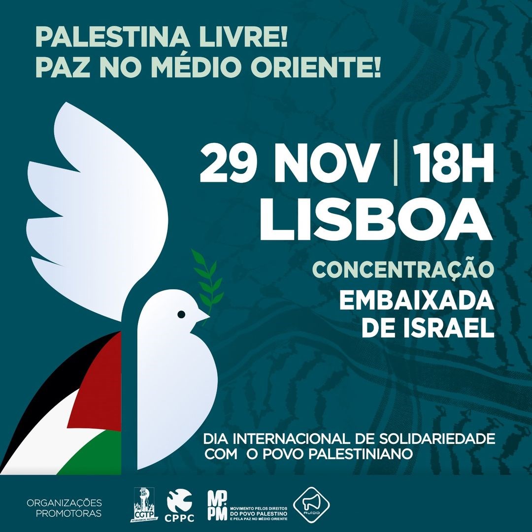 Assinalando o Dia Internacional de Solidariedade com o Povo Palestiniano, e sob o mote «Palestina Livre! Paz no Médio Oriente!», no dia 29 de novembro, às 18 horas, CGTP-IN, CPPC, MPPM e Projecto Ruído convocam uma concentraçao em frente à Embaixada de Israel, em Lisboa.
