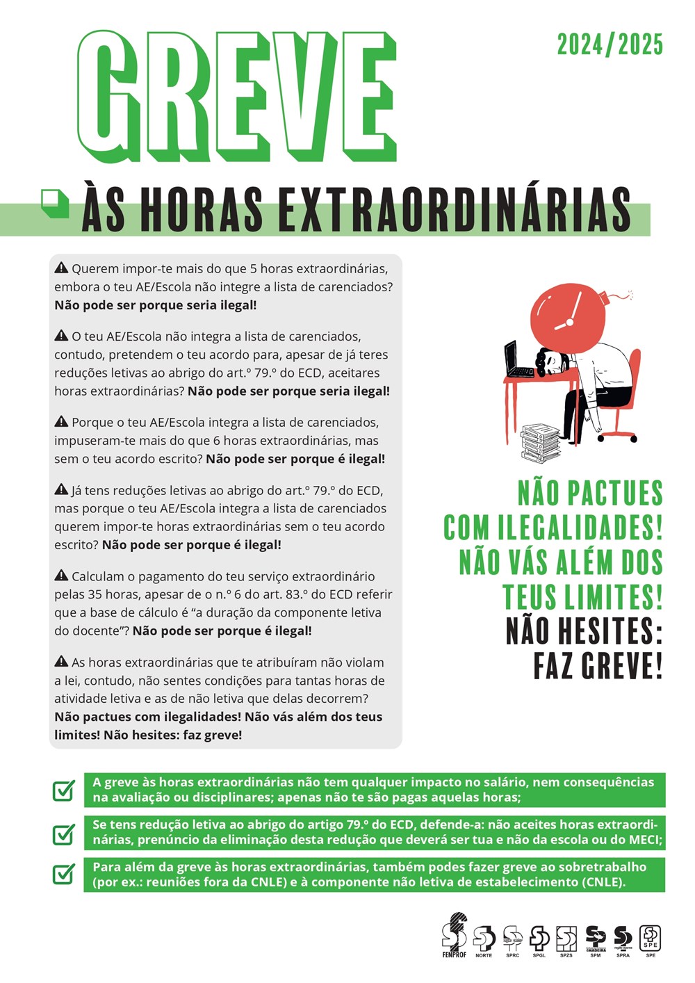 A FENPROF reitera o apelo aos professores com horas extraordinárias, em especial àqueles a quem estas foram atribuídas e/ou pagas ilegalmente, para que façam greve, rejeitando, assim, as ilegalidades que estão a ser cometidas.