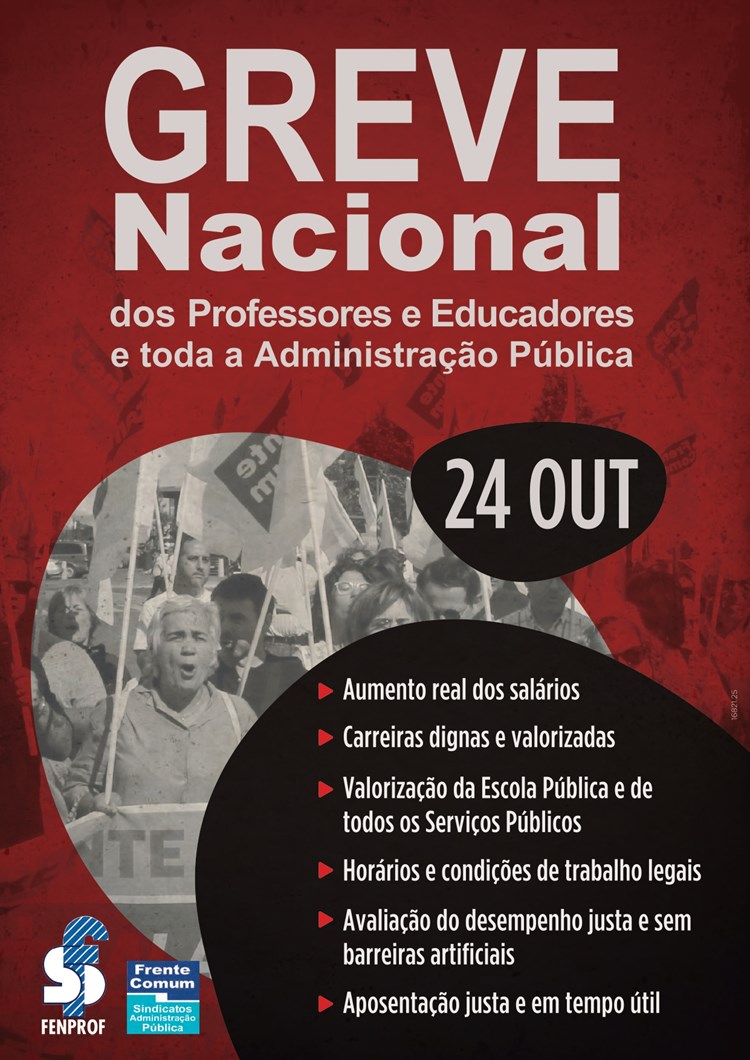 Pelos motivos que acima se explicitam, a FENPROF decidiu convocar greve nacional de professores, educadores e investigadores para o dia 24 de outubro de 2025, entre as zero e as 24 horas, convergindo com as demais organizações sindicais representativas de trabalhadores da administração pública no âmbito da Frente Comum de Sindicatos da Administração Pública. Esta greve incide sobre todo o serviço distribuído nesse dia. Os docentes e investigadores que adiram à greve não terão de comunicar previamente, nem em qualquer outro momento, a qualquer entidade a sua decisão.