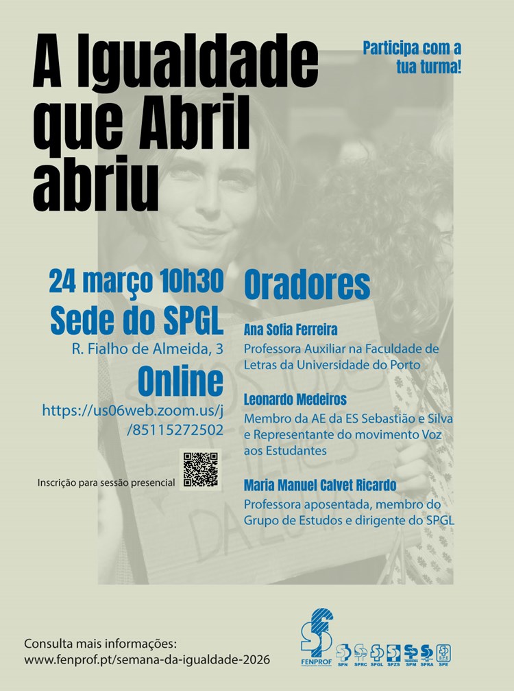Neste contexto, a FENPROF vai promover uma sessão especial, dirigida às escolas, “A Igualdade que Abril abriu”, no dia 24 de março (terça-feira), pelas 10:30 horas, em formato misto: