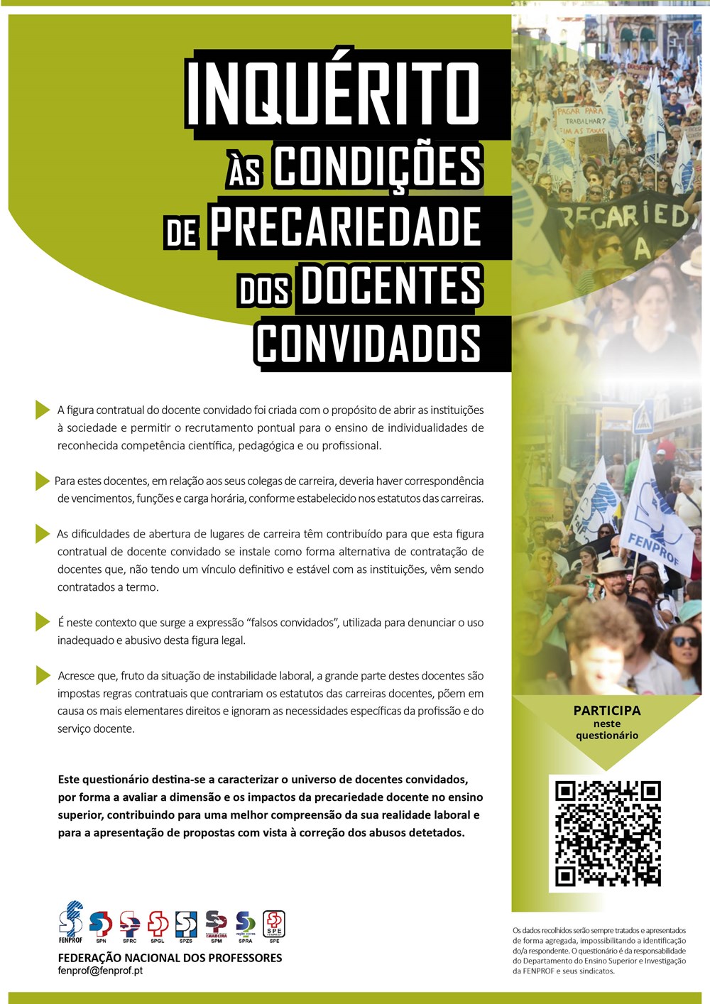 Esclarecemos que este questionário se insere na estratégia de ação da FENPROF e dos seus sindicatos no combate à precariedade, bem como na valorização e dignificação das carreiras docentes. A informação recolhida será fundamental para reforçar a intervenção sindical junto das instituições de ensino superior e dos decisores políticos, conforme previsto na Resolução sobre a Ação Reivindicativa aprovada no 15.º Congresso Nacional dos Professores.