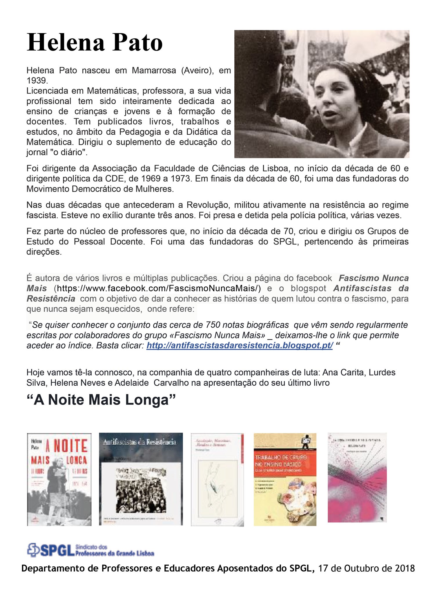 Em 17 de outubro de 2018 ocorreu, no Auditório do SPGL, mais uma sessão de “O meu Livro quer outro Livro”, organizada pelo Departamento de Professores e Educadores Aposentados do SPGL, desta vez tendo como convidada Helena Pato, para apresentar o seu livro” A Noite mais longa de todas as Noites”, publicado em 2ª edição.
