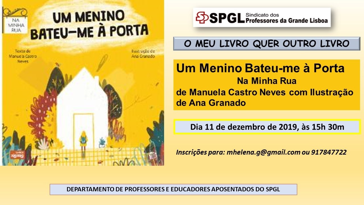 No próximo dia 11 de Dezembro realizaremos mais uma sessão de "O MEU LIVRO QUER OUTRO LIVRO" com a presença da nossa colega e sócia do SPGL Manuela Castro Neves que nos irá apresentar o seu livro "Um Menino Bateu-me à Porta".