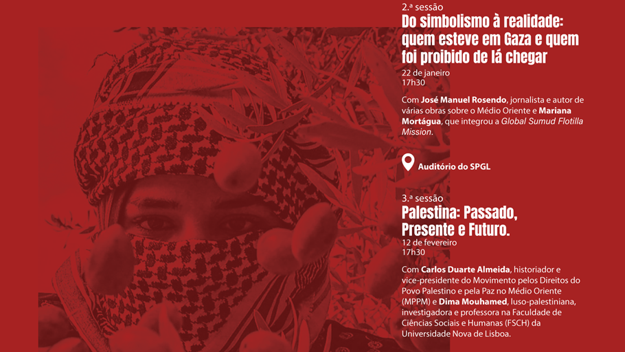 No próximo dia 22 de janeiro, às 17h30, no auditório do SPGL, realizamos a 2ª sessão: "Do Simbolismo à Realidade: quem esteve em Gaza e quem foi proibido de lá chegar".
