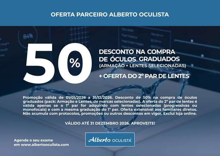 Descontos: 30% em óculos graduados; 20% em óculos de sol; 20% em lentes de contacto; 10% em produtos de manutenção e acessórios; exames visuais de optometria e medição de tensão ocular gratuitos sem marcação e sem compromisso. (Ver Protocolo)