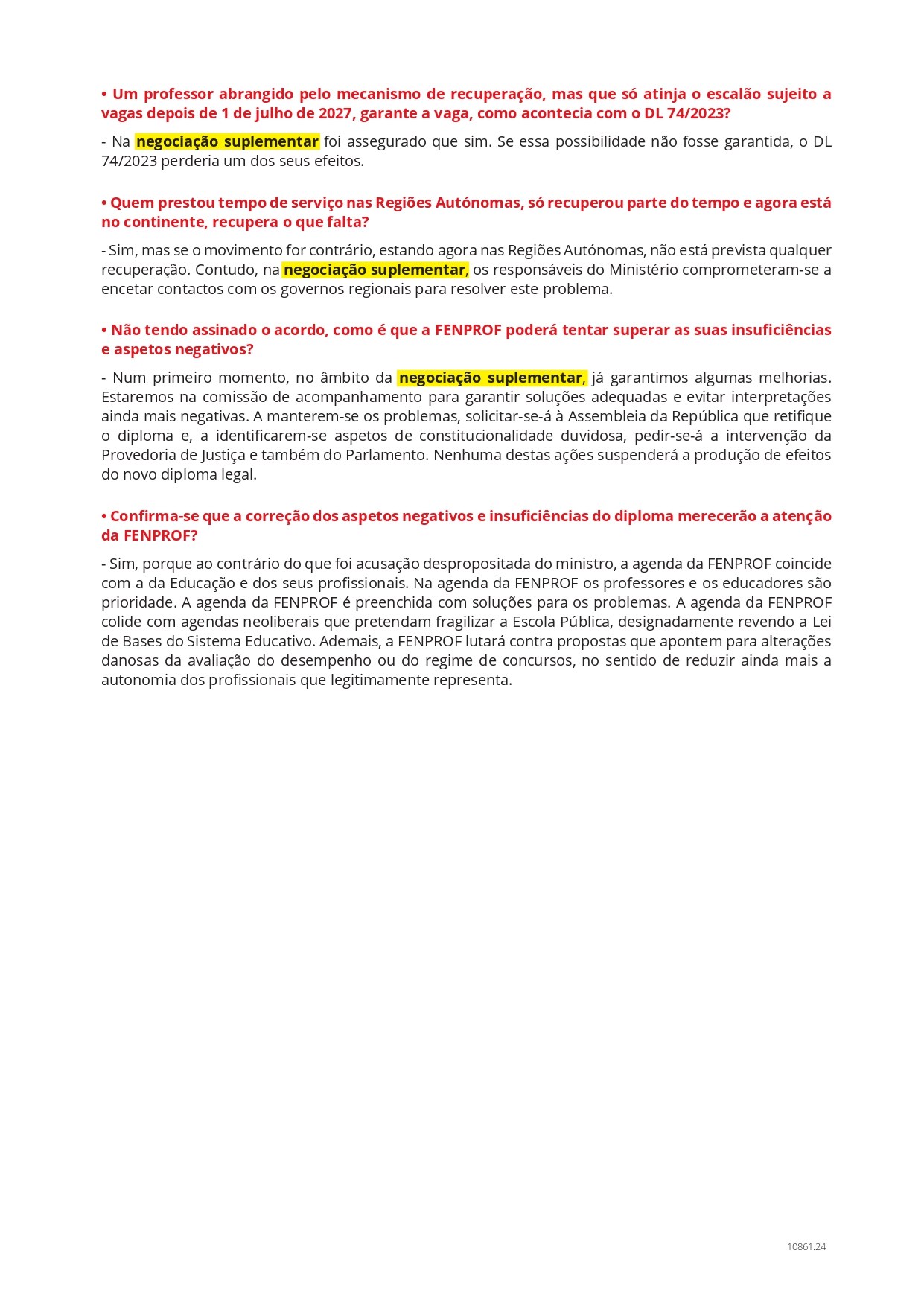 Questionado pela comunicação social, o Secretário de Estado Adjunto e da Educação afirmou que não houve qualquer alteração ao acordo assinado por FNE e outros. É verdade. Foram vários os avanços obtidos na negociação suplementar, mas se a FNE e outros não tivessem assinado aquele acordo, seguramente, agora, estaríamos a anunciar mais ganhos. A FENPROF não se resignará e tudo fará, no âmbito das instâncias adequadas, para melhorar o diploma legal que for publicado.