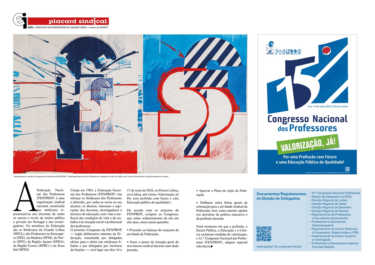O próximo Congresso da FENPROF — órgão deliberativo máximo da Federação, constituído por delegados eleitos para o efeito nos sindicatos filiados e por delegados por inerência de funções —, terá lugar nos dias 16 e 17 de maio de 2025, no Fórum Lisboa, em Lisboa, sob o lema «Valorização, já! Por uma profissão com futuro e uma Educação pública de qualidade!».
