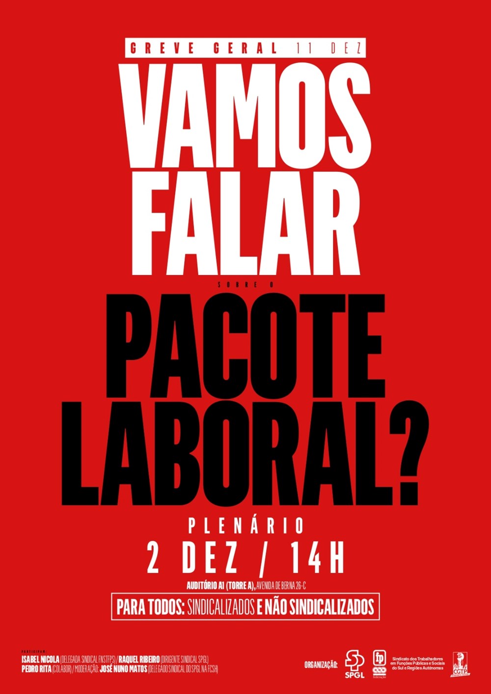 No dia 2 de dezembro, a partir das 14h, irá decorrer um plenário na Nova-FCSH (Auditório A1 - Torre A) em torno da atual proposta do Código Laboral avançada pelo atual governo em funções, uma iniciativa do Sindicato dos Professores da Grande Lisboa (SPGL), conjuntamente com o Sindicato dos Trabalhadores em Funções Públicas e Sociais do Sul e das Regiões Autónomas (STFPSSRA) e a Confederação Geral dos Trabalhadores Portugueses (CGTP). O seu objetivo reside tanto na análise das suas medidas fundamentais, as quais representam uma tentativa de ataque generalizado a direitos, liberdades e garantias de quem trabalha (inclusive nas universidades), como na mobilização para a greve geral, anunciada para o próximo dia 11 de dezembro de 2025.
