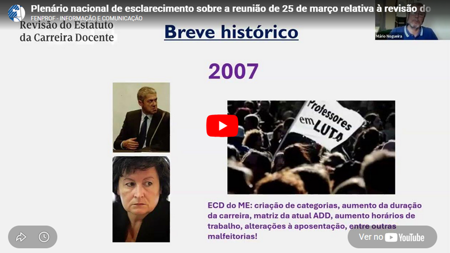 - Histórico das revisões do ECD: propósitos dos governos, propostas da FENPROF e dos professores, o papel da luta e da intervenção dos docentes e da sua Federação – lembrar os embates do passado para compreender o alcance da revisão agora em curso. Este ponto contará com a intervenção de MÁRIO NOGUEIRA