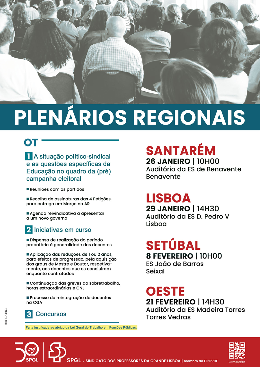 A par das reuniões que o SPGL realizou e continua a realizar nas escolas, nos meses de janeiro e fevereiro terão lugar quatros grandes Plenários Sindicais Regionais (Santarém, Lisboa, Setúbal e Oeste). Participa!