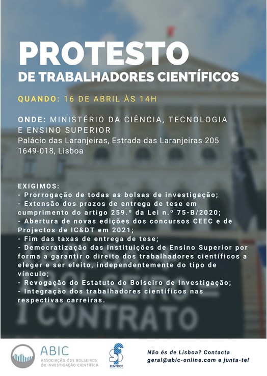 A ABIC e a FENPROF convocam todos os trabalhadores científicos a comparecer, no dia 16 de Abril, pelas 14 horas, em frente ao Ministério da Ciência, Tecnologia e Ensino Superior, numa acção de protesto pelos direitos dos trabalhadores científicos.