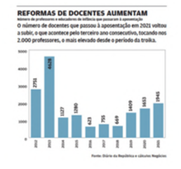 O Jornal de Negócios anuncia hoje que o número de docentes que se aposentaram em 2021 atingiu o nível mais alto desde 2013, durante o período da Troika.