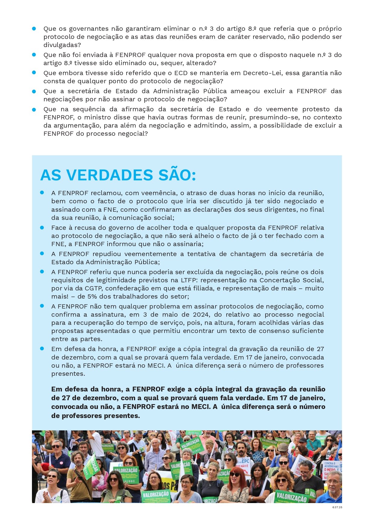 O Secretariado Nacional da FENPROF entregou no Ministério da Educação, Ciência e Inovação um requerimento formalizando o pedido de divulgação da gravação da reunião de 27 de dezembro, em defesa da sua honra e para que se esclareça, definitivamente, o que se passou nessa reunião e o que levou à não assinatura do protocolo negocial proposto pelo governo. Mário Nogueira revelou que a FENPROF já recebeu a convocatória para a primeira reunião negocial, a 17 de janeiro, e que já está a trabalhar nas propostas a apresentar ao governo, que resultarão de uma ampla consulta aos docentes a realizar ao longo de todo o mês de fevereiro.