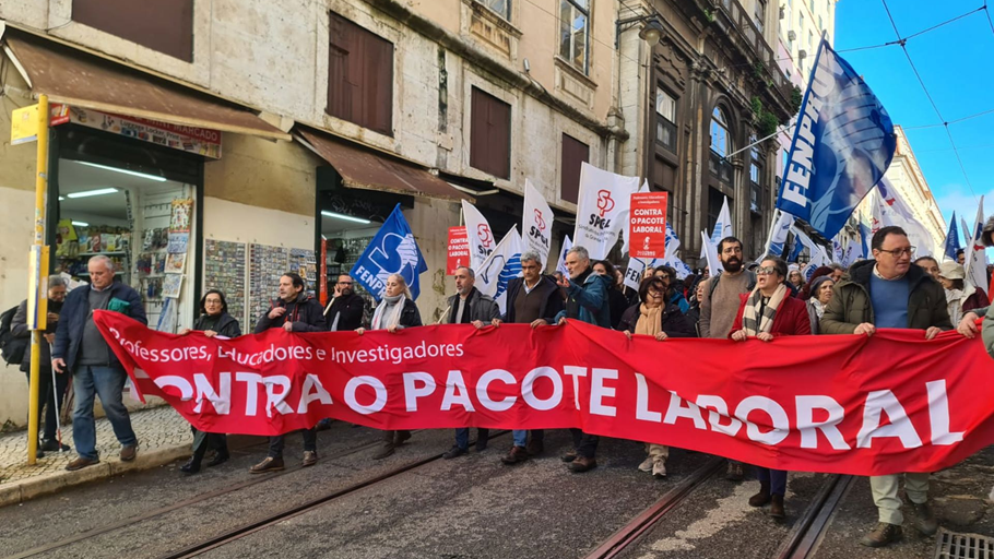 Milhares de trabalhadores, entre os quais centenas de docentes e investigadores, desfilaram esta terça-feira, 13 de janeiro de 2026, entre o Largo de Camões e a Assembleia da República, em Lisboa, na manifestação promovida pela CGTP-IN contra o pacote laboral apresentado pelo governo. Em São Bento, foi entregue um abaixo assinado que reuniu 190 mil assinaturas, entre as quais cerca de 15 mil assinaturas de professores, educadores e invetigadores. «Senhor primeiro ministro, oiça bem, mais de 190 mil assinaturas que dizem e afirmam – o pacote laboral é para rejeitar e o que exigimos é a sua retirada!», afirmou o Secretário-geral da CGTP-IN, Tiago Oliveira.