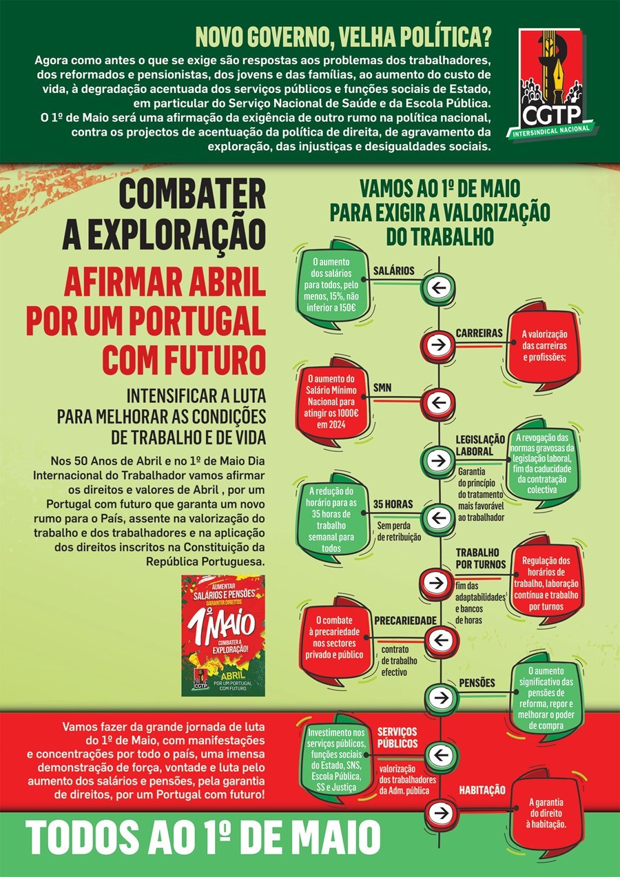 Nos 50 Anos de Abril e no 1.º de Maio Dia Internacional do Trabalhador vamos afirmar os direitos e valores de Abril, por um Portugal com futuro que garanta um novo rumo para o País, assente na valorização do trabalho e dos trabalhadores e na aplicação dos direitos inscritos na Constituição da República Portuguesa.