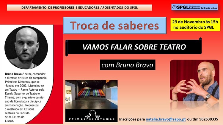 Convidamos-te para participares, no próximo dia 29 de novembro, às 15h, numa conversa sobre Teatro com o ator e encenador Bruno Bravo, dentro do projeto “Troca de Saberes” do nosso Departamento.
